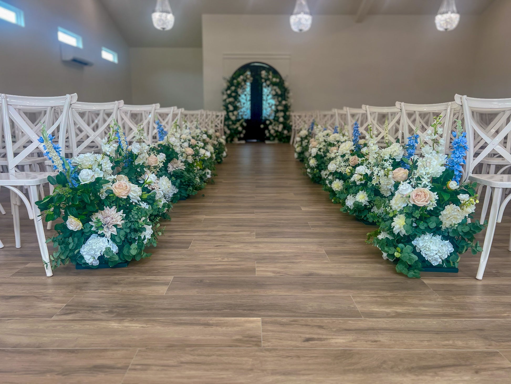 Experience the dreamy elegance of our Something Blue Collection. This grand floral pillars set, or "deconstructed Arch", boasts an abundance of greenery and stunning bouncy blooms for a neutral and stunning backdrop. Elevate your event with this breathtaking focal point. This collection serves as your starting point for a fully customized floral experience. Secure your rental with a $1,200 deposit—equal to the arch rental cost—and our team will reach out to guide you through enhancing your package. Add 12 coordinating aisle meadows, statement florals, lush centerpieces, and more to create a cohesive, personalized design that brings your vision to life.