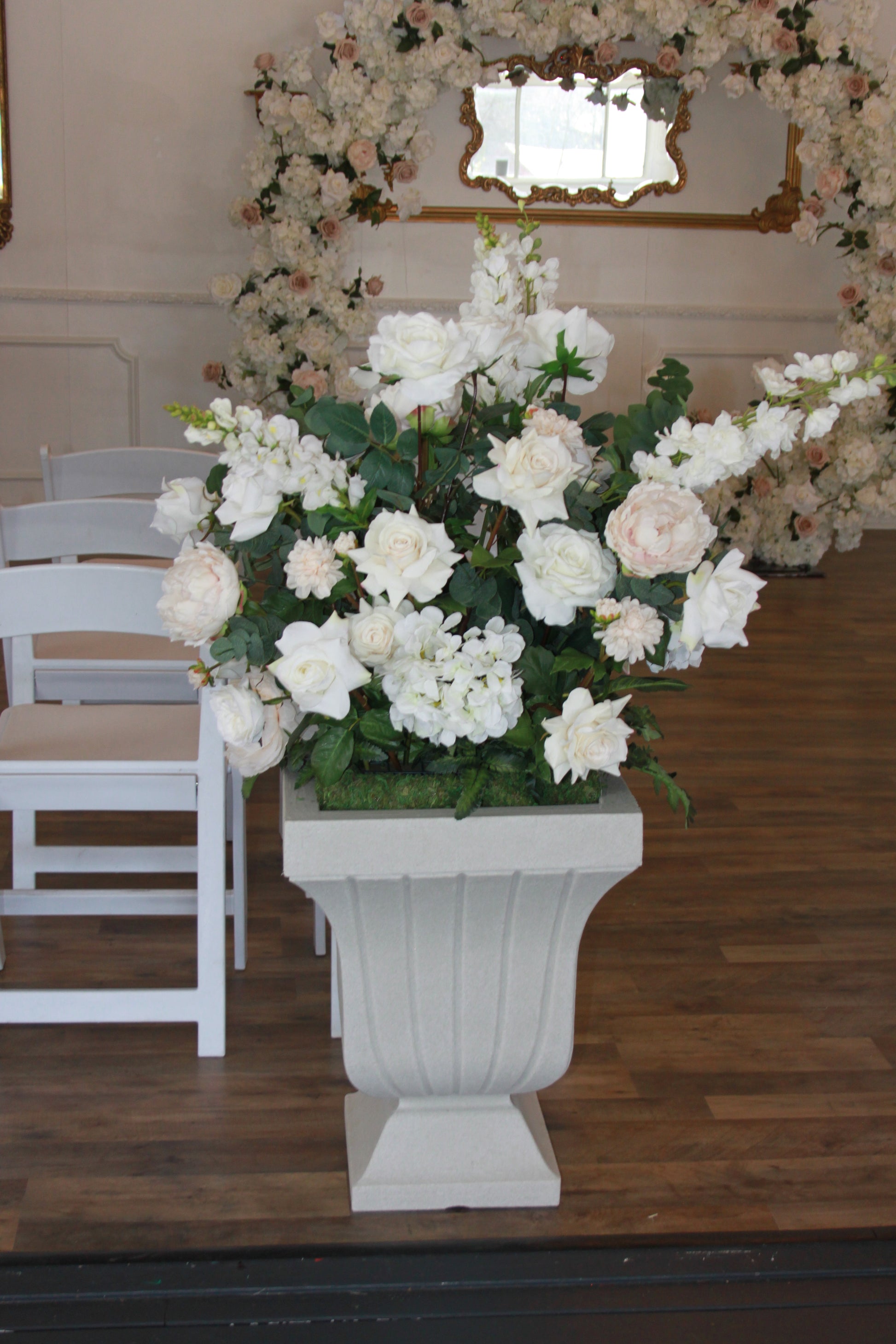 Dimensions: 4'2" tall floor to bloom tip Urn bases are 1'6' square and measure 1'11" floor to urn opening each urn roughly 3'3" wide bloom tip to bloom tip