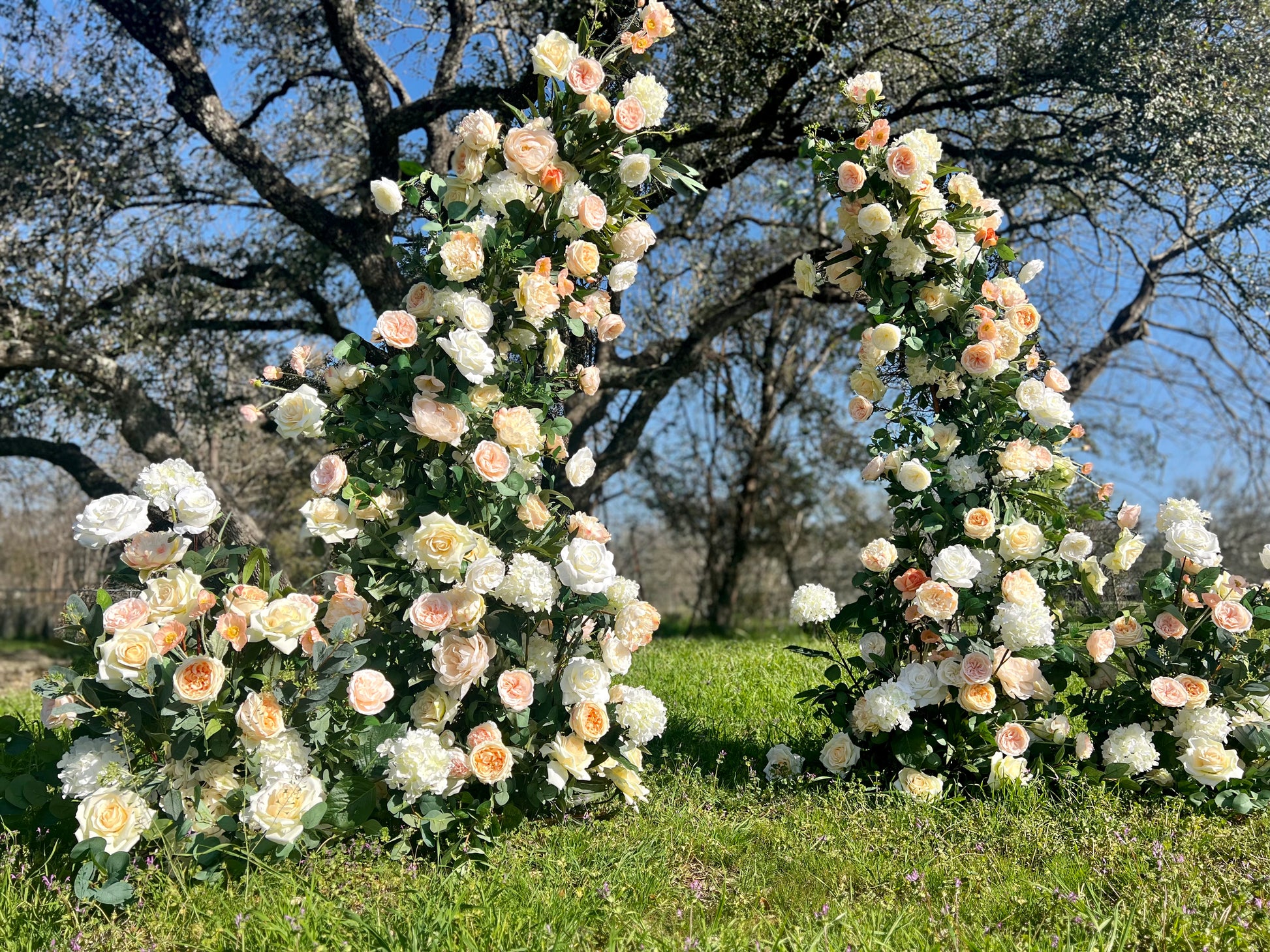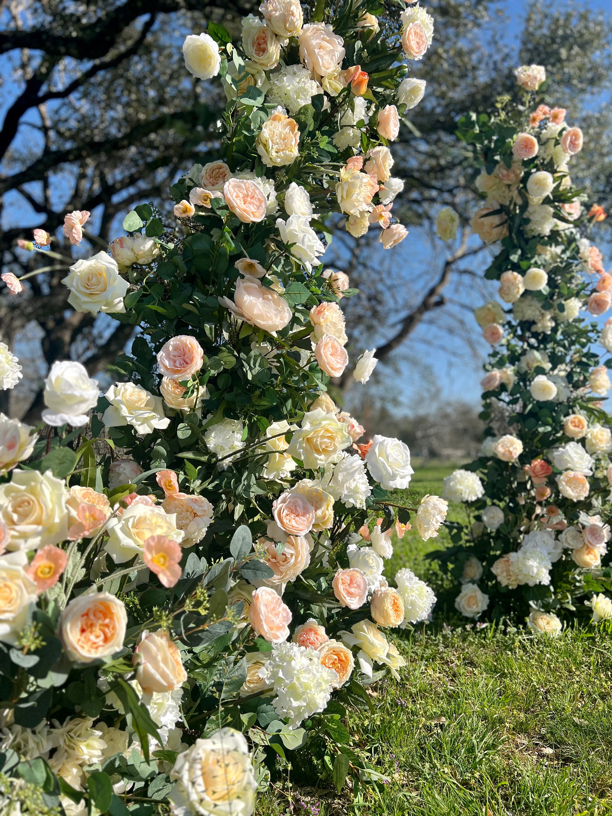Add a touch of peach and sunset hues to your wedding with our Sunset Serenity Arch. This sweet and romantic arch features a horned design in white and cream, accented with aisle blooms for a full and lush base. Create a dreamy and picturesque backdrop for your special day with this stunning piece.